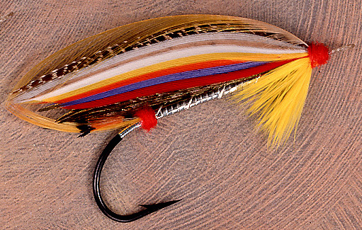 Tag: Silver tinsel Tail: A toppind and tippet in strands Butt: Scarlet Berlin wool Body: Flat silver tinsel Ribs: Fine oval tinsel Throat: A lemon hackle Wings: Mixed -- peacock herl in strands; "married" strands of scarlet, blue, orange, yellow, and white swan, cinnamon and light mottled grey turkey tail and bustard; a topping over all Head: Scarlet Berlin wool Tied by William Hrinko Reference: Pryce-Tannatt (1914) How to Dress Salmon Flies. London: Adam and Charles Black