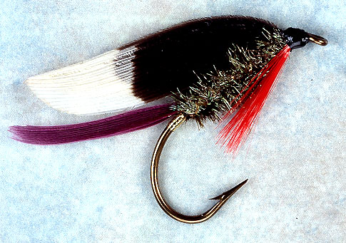 Tag: Gold tinsel Tail: Light claret Body: Peacock herl Rib: Gold tinsel Hackle: Deep wine Wing: White tipped turkey
