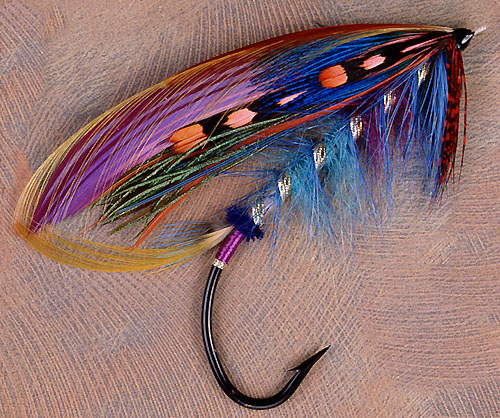 Tag: Fine oval silver tinsel and purple silk Tail: Golden pheasant crest and blue chatterer Butt: Blue ostrich herl Body: Two turns pale lavender silk followed by blue seal fur and purple seal fur, well picked out after ribbing applied Ribbing: Oval silver and oval gold tinsel Hackle: Blue Throat: Guinea fowl dyed crimson Wing: Thin strips of blue and gold macaw, and scarlet macaw; Peacock herl; married strips of pale lavender and purple dyed white florican (repeated three timese), and married strips of purple and crimson dyed white florican (repeated three times) Topping: Golden pheasant crest Sides: Jungle cock dyed crimson Cheeks: Peacock breast and jungle cock dyed crimson Horns: Lady Amherst crest, short Original 8/0 fly from: The Art of the Classic Atlantic Salmon Fly (1989)