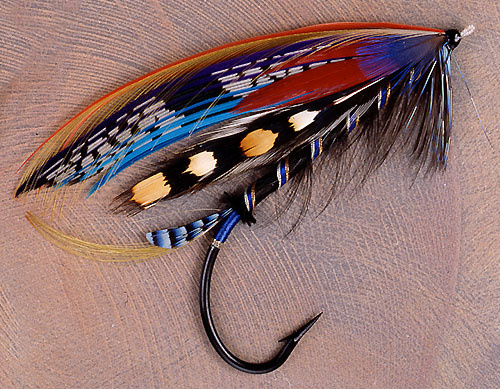 Tag: Fine oval silver tinsel and blue silk Tail: Golden pheasant crest and Eurasian jay Butt: Black ostrich herl Body: Black silk Ribbing: Fine oval silver tinsel, blue silk, fine oval gold tinsel Hackle: Black hackle Throat: Black hackle and Eurasian jay Wing: Two pair jungle cock, long and partially overlapping; married strips of white florican bustard dyed light blue and Lady Amherst tail (repeated four times) followed by married strips of white florican bustard dyed purple and Lady Amherst tail (repeated four times) Topping: Golden pheasant crest Horns: Scarlet macaw Cheek: Lady Amherst sword and purple kingfisher Original 8/0 fly from: The Art of the Classic Atlantic Salmon Fly (1989)