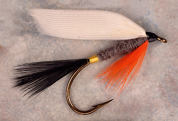 Adirondack Tied by Don Bastian Tag: Yellow floss Tail: Black hackle tips Body: Gray fur Hackle: Orange Wing: White This page designed and copyrighted © 2000 The Complete Sportsman