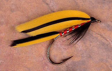 Tag: Gold tinsel Tail: Black and yellow Body: Crimson floss Rib: Gold tinsel Hackle: Black Wing: Black stripe over yellow