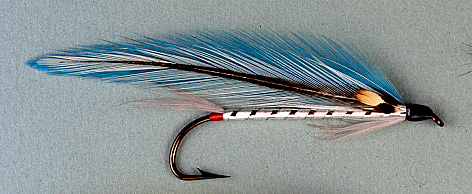 Tail: Gray hackle fibers Butt: Red floss Body: Tapered white floss Rib: Flat silver tinsel, over body only Throat: Gray hackle fibers Wing: Two medium blue hackles flanked by silver badger hackles Cheeks: Jungle cock Notes: Created by Lew Oatman. Source: Bates, J. (1950, 1966, 1995) Streamer Fly Tying and Fishing, p.222