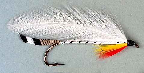Tail: Barred wood duck Body: White floss Rib: Flat silver tinsel Wing: White saddle hackles Throat: Red followed by yellow hackle Source: Leonard, J.E. (1950, 1982) Flies, p. 260