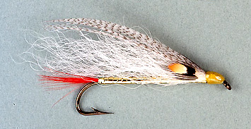 Tail: Crimson hackle fibers Body: Several layers of flat narrow gold tinsel, lacquered Wing: White hair from a calf or fox tail extending to the end of the tail, over which is another bunch of the same hair half as long as the first one Topping: Two narrow sections of gray mottled mallard Cheeks: Jungle cock Notes: Created by Ray Salminen. Source: Bates, J. (1950, 1966, 1995) Streamer Fly Tying and Fishing, p. 223