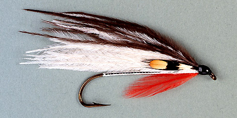 Body: Medium flat silver tinsel Throat: Three or four scarlet hackle tips Wing: White followed by brown ostrich herl, Topping: Four or five strands of peacock herl. (Not in original dressing but later added by creator) Cheeks: Jungle cock (optional) Notes: Created by Anson Bell. Tied by Don Bastian Source: Bates, J. (1950, 1966, 1995) Streamer Fly Tying and Fishing, p.224; Stewart, D. and Leeman, B. (1982) Trolling Flies for Trout and Salmon, p. 94