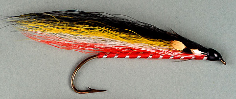 Body: Red floss Rib: Flat silver tinsel Wing: Red, white, yellow, and black bucktail Cheeks: Jungle cock Notes: Created by Bob Bibeau for the Sebago lake area of Maine. Source: Stewart, D. and Leeman, B. (1982) Trolling Flies for Trout and Salmon, p. 61