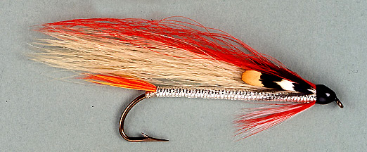 Tag: Fine oval gold tinsel Tail: Red and yellow hackle fibers, mixed Body: Oval silver tinsel Throat: Red and white hackle fibers, mixed Wing: White polar bear topped by red bucktail Cheek: Jungle cock Source: Ray Bergmans fly tying notes