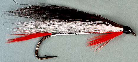 Tail: Red hackle fibers Body: Flat silver tinsel Throat: Red hackle Wing: Dark brown bucktail on top of white bucktail Source: Bergman (1938) Trout
