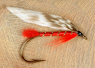 Tag: Scarlet tag Body: Red floss Rib: Gold tinsel Hackle: Red Wing: Gray turkey or any mottled black and white