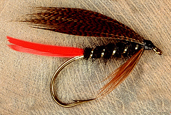 Tag: Gold tinsel Tail: Scarlet Body: Black seal fur Rib: Gold tinsel Hackle: Brown Wing: Brown mallard