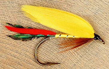 Tag: Gold tinsel Tail: Peacock sword and scarlet Body: Yellow floss Rib: Gold tinsel Hackle: Brown Wing: Yellow