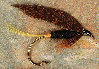 Tag: Orange floss Tail: Golden pheasant crest Body: Black dubbing Hackle: Furnace brown Wing: Brown turkey