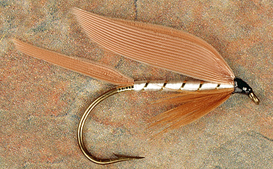 Tag: Gold tinsel Tail: Cinnamon Body: White floss Rib: Gold tinsel Hackle: Brown Wing: Cinnamon (Orpington cock)