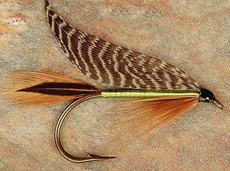 Tail: Furnace hackle Body: Green floss Hackle: Light brown furnace Wing: Teal