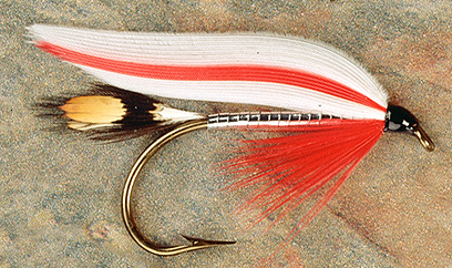 Tail: Jungle cock eye Body: Silver tinsel Hackle: Crimson Wing: White with crimson stripe