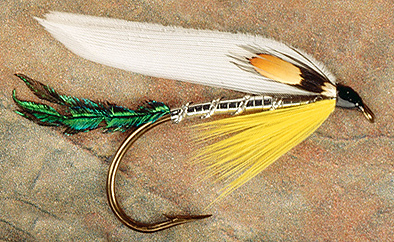 Tail: Peacock sword Body: Flat silver tinsel Rib: Silver tinsel Hackle: Yellow Wing: White -- also jungle cock eye