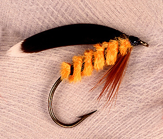Body: Orange chenille Rib: Black floss Hackle: Brown Wing: Black with white tag turkey