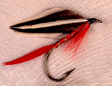 Tag: Gold tinsel Tail: Light claret Body: Dark red floss Rib: Gold tinsel Hackle: Light claret Wing: Jungle body feather