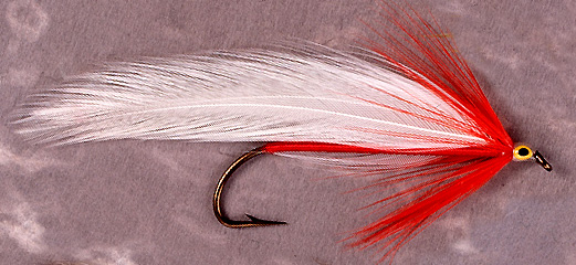 Body: Thin red floss Throat: Scarlet collar Wing: Four long white saddles Head: White lacquered with yellow painted eyes Source: Perrault, K.E. (1984) Standard Dictionary of Fishing Flies, p.385