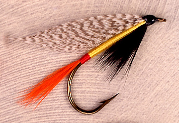 Tag: Red floss Tail: Orange Body: Yellow floss Hackle: Black Wing: Gray mallard