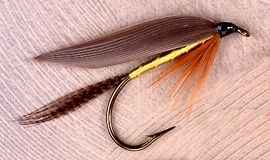 Tail: Brown mallard Body: Light green floss Rib: Yellow silk Hackle: Brown Wing: Light slate