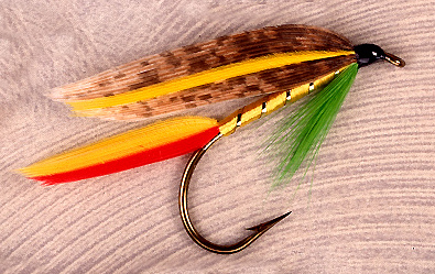 Tag: Gold tinsel Tail: Yellow and crimson Body: Yellow floss Rib: Gold tinsel Hackle: Green hackle Wing: Brown turkey, yellow stripe
