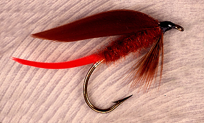Tag: Gold tinsel Tail: Crimson Body: Fiery brown wool Hackle: Brown Wing: Brown