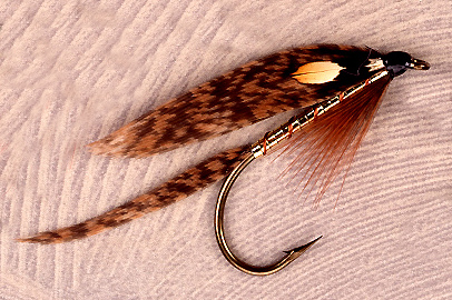 Tail: Brown turkey Body: Gold tinsel Rib: Brown silk Hackle: Brown Wing: Brown turkey Cheek: Jungle cock