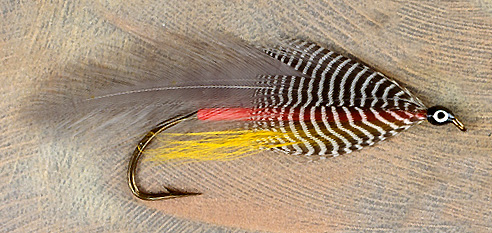 Body: Fluorescent red floss Wing: Four very dark blue dun saddle hackles Throat: Golden yellow imitation bucktail extending to bend of hook Shoulder: Dark teal flank feathers, about 1/3 wing length Eyes: Painted white with black eye Note: Other variations of this fly exist. Source: Stewart, D. and Leeman, B. (1982) Trolling Flies for Trout and Salmon, p. 68