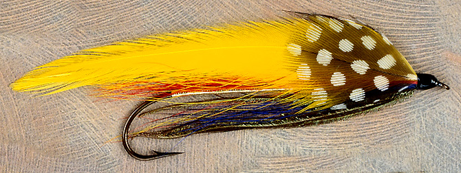 Body: Flat gold tinsel Throat: Dark blue bucktail next to body, then 5 strands of peacock herl, all length of body Wing: Red followed by yellow bucktail, then flanked on each side by yellow saddle hackles Shoulder: Guinea hen body feather, 1/3 length of wing Note: Originated by taxidermist David Footer of Lewiston, Maine. Source: Stewart, D. and Leeman, B. (1982) Trolling Flies for Trout and Salmon, p. 68; Leiser, E. (1987) The Book of Fly Patterns, p.250