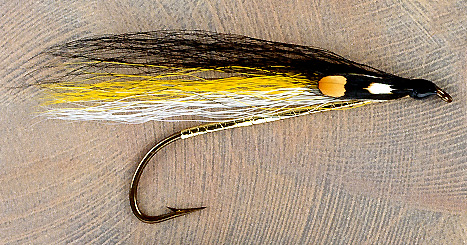Body: Flat gold tinsel Rib: Gold wire Wing: White bucktail followed by yellow bucktail, followed by black bucktail (goat or other hair may be used) Cheek: Jungle cock Source: Leonard, J.E. (1950, 1982) Flies, p. 263