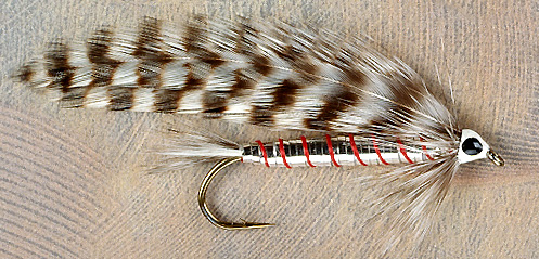 Tail: Grizzly or white hackle fibers Body: Silver tinsel over floss base, minnow shape Rib: Crimson thread Throat: Grizzly beard Wing: Two grizzly hackles, with two more tied in at higher angle Head: Large white head each side with painted black pupil Source: Perrault, K.E. (1984) Standard Dictionary of Fishing Flies p.387