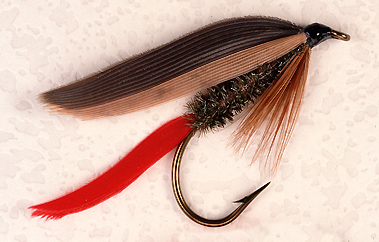 Tail: Dark scarlet Body: Peacock herl Hackle: Brown Wing: Slate married to cinnamon