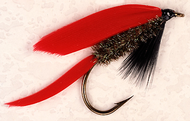 Tail: Dark scarlet Body: Peacock herl Hackle: Black Wing: Dark scarlet