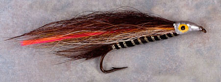 Tail: Brown hair Body: Black wool Rib: Embossed silver tinsel Wing: White followed by yellow followed by brown bucktail Sides: Single, long strand of magenta silk Head: Silver with yellow eye and black pupil