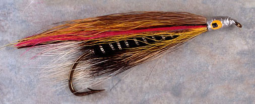 Tag: Embossed silver tinsel Body: Black wool Rib: Embossed silver tinsel Belly: Gray squirrel tail Wing: Yellow bucktail followed by brown bucktail Sides: One strand of magenta and light blue silk, as long as wing Head: Silver with yellow eye and black pupil
