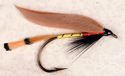 Tail: Golden pheasant tippet Body: Scarlet and yellow floss Rib: Gold tinsel Hackle: Black Wing: Cinnamon "Orpington"