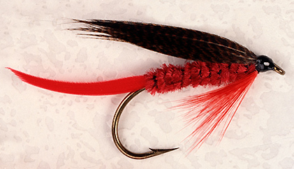 Tail: Scarlet Body: Deep wine chenille Hackle: Scarlet Wing: Brown mallard