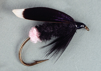 Perry Tied by Don Bastian Tag: Pink chenille tag Body: Black chenille Hackle: Black Wing: Black turkey with white tag This page designed and copyrighted © 2000 The Complete Sportsman