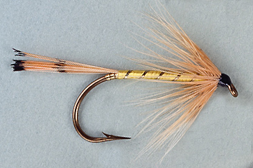 Tag: Gold tinsel Tail: Golden pheasant tippet Body: Yellow floss Rib: Gold tinsel Hackle: Light ginger