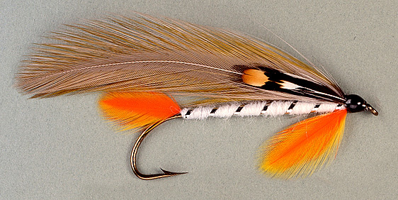 Tail: Yellow hackle tips flanked by orange hackle tips Body: White wool, slightly tapered Rib: Oval silver tinsel Throat: Yellow hackle tips, flanked by orange hackle tips Wing: Two olive-green saddle hackles, flanked by a gray-blue dun saddle hackle Cheeks: Jungle cock Note: Created by Lew Oatman. Tied by Greg Nault.