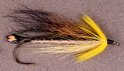 Tail: Jungle cock, back to back Body: Silver silk ribbed with embossed silver tinsel Belly: Fine white goat hair Wing: Several strands fine peacock herl followed by raccoon fur Throat: Yellow hackle, collar style Note: Created and tied by Paul Rossman.