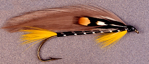 Tail: Yellow hackle barbules Body: Black floss Rib: Flat silver tinsel Wing: Four bronze dun saddle hackles Throat: Yellow hackle barbules, beard style Cheek: Jungle cock Source: Stewart, D. and Leeman, B. (1982) Trolling Flies for Trout and Salmon, p. 113