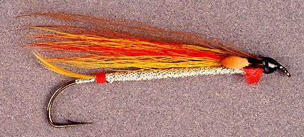 Tag: Embossed silver tinsel Tail: Golden pheasant crest feathers, curving upward Butt: Red wool Body: Embossed silver tinsel. Just behind the head is another butt of red wool of the same size as the butt at the rear Rib: Oval silver tinsel Wing: Yellow bucktail, over which is red bucktail, over which is yellow bucktail, and then brown bucktail Cheeks: Jungle cock Note: Created by Everett Price. Source: Bates, J. (1950, 1966, 1995) Streamer Fly Tying and Fishing, p. 327