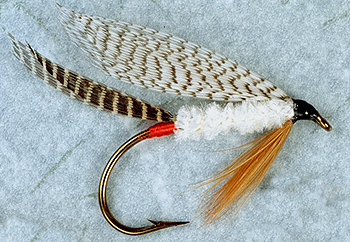 Tag: Scarlet floss Tail: Teal Body: White chenille Hackle: Brown Wing: Gray mallard