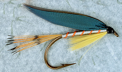 Tail: Pheasant tippet Body: Palest gray floss Rib: Orange floss Hackle: Pale yellow Wing: Light blue parrot