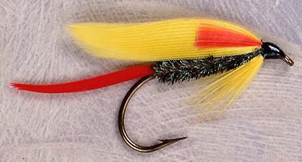 Tail: Scarlet Body: Peacock herl Hackle: Yellow Wing: Yellow with scarlet cheek