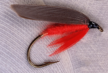 Tag: Gold tinsel Body: Scarlet wool Hackle: Scarlet Wing: Slate