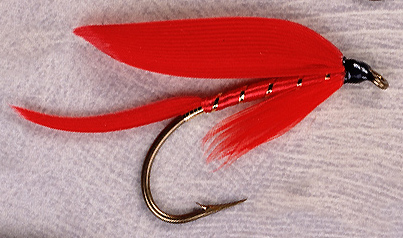 Tag: Gold tinsel Tail: Scarlet Body: Scarlet floss Rib: Gold tinsel Hackle: Scarlet Wing: Scarlet
